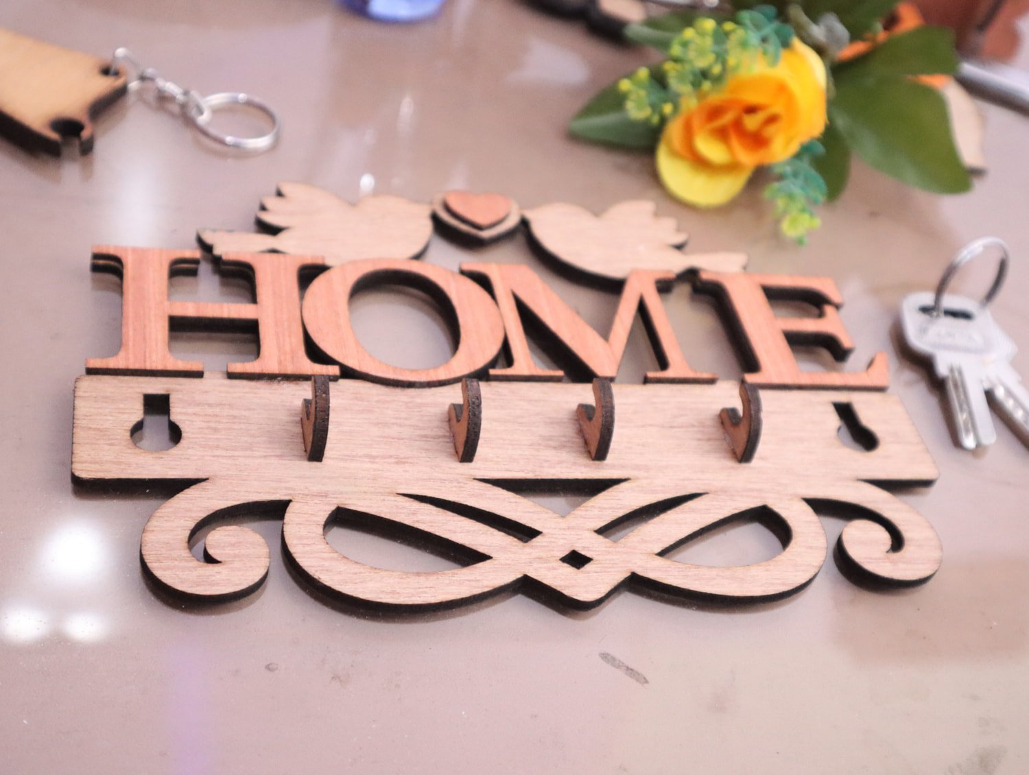 • Design: Bold letters spelling “HOME” with two birds and a heart above, along with decorative hooks below.