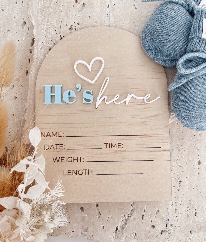 • Elegant Typography : The phrase “He’s here” is engraved in a stylish, modern font, accompanied by a delicate heart symbol, adding a touch of love and tenderness.