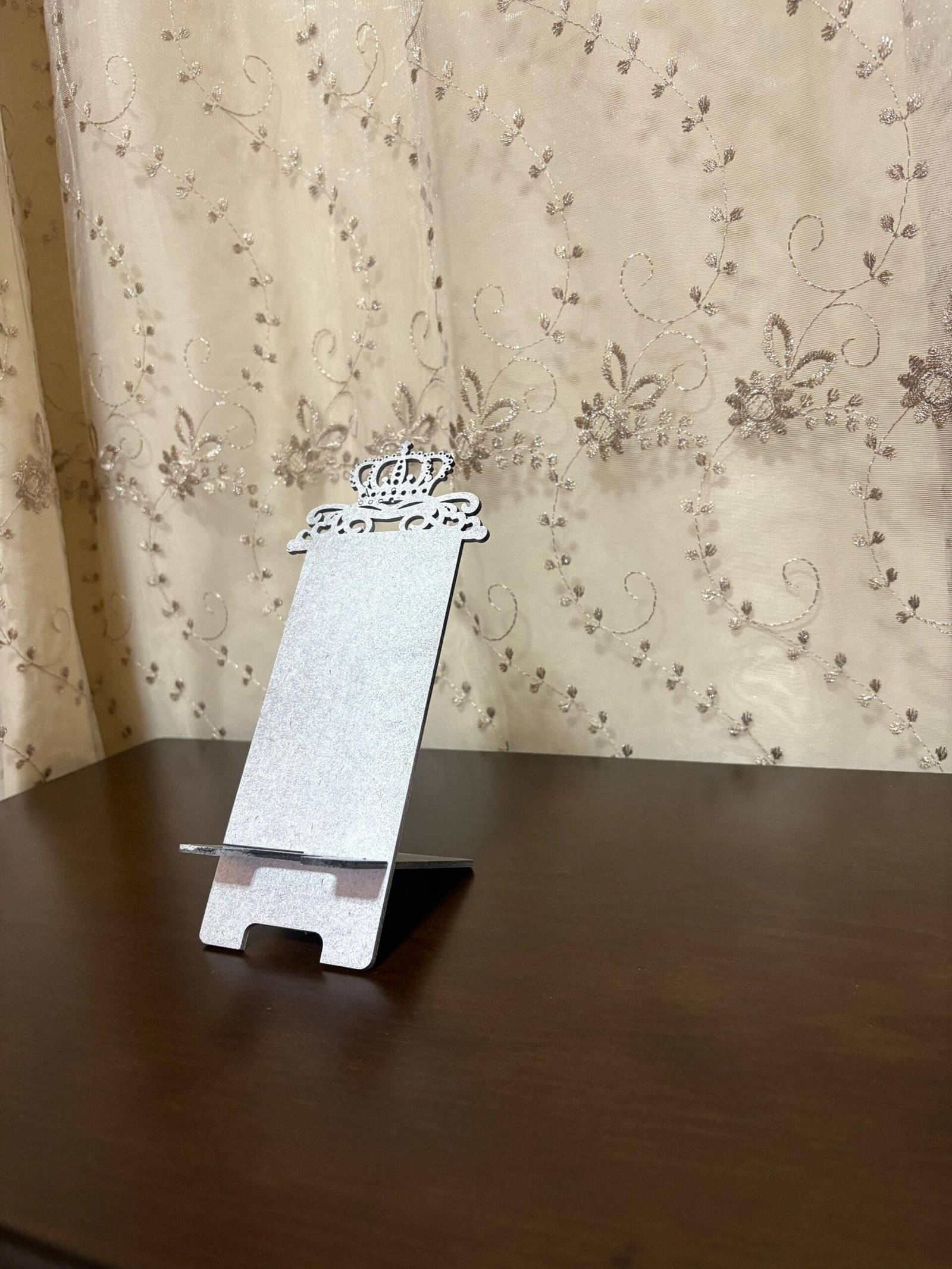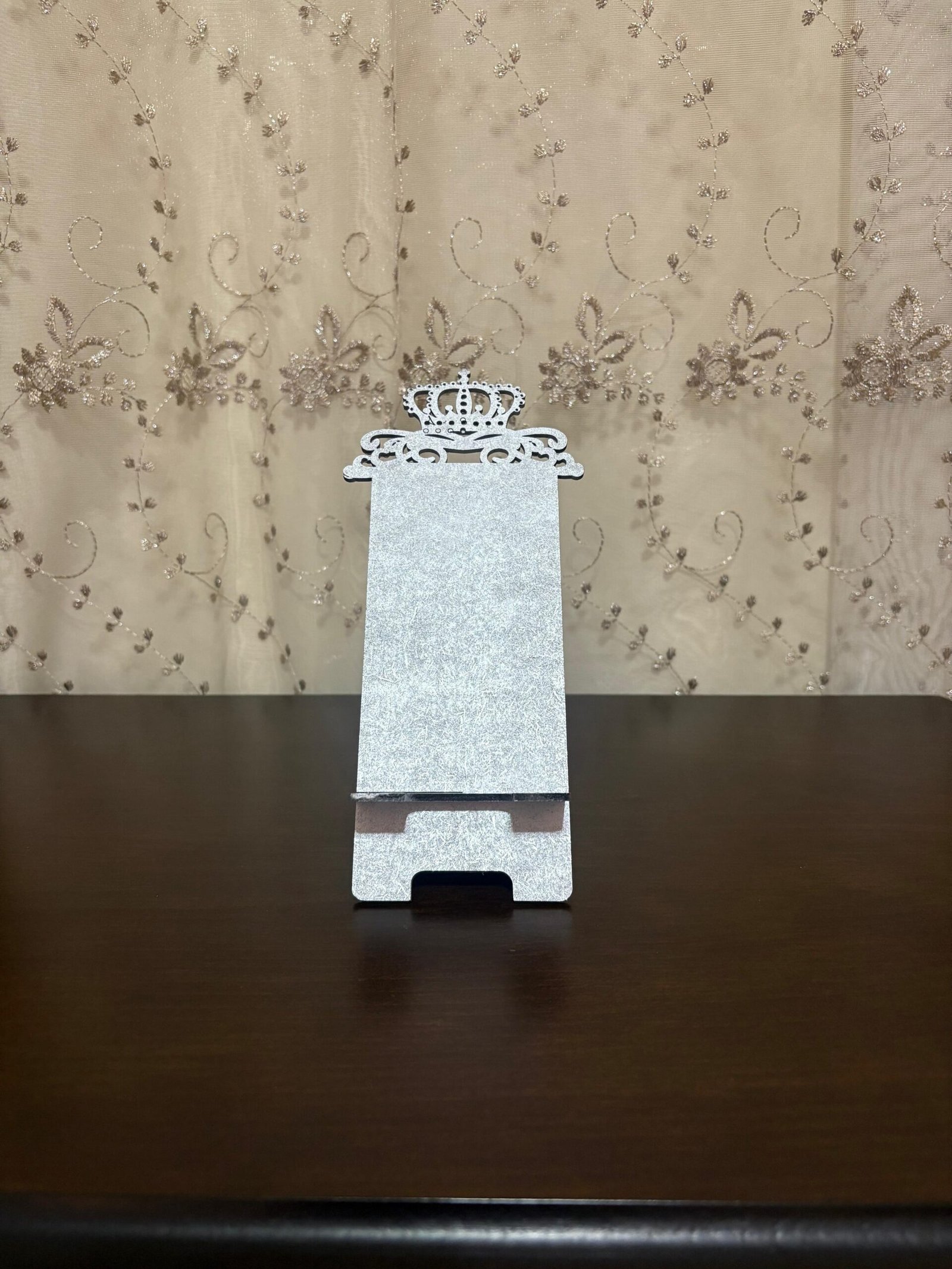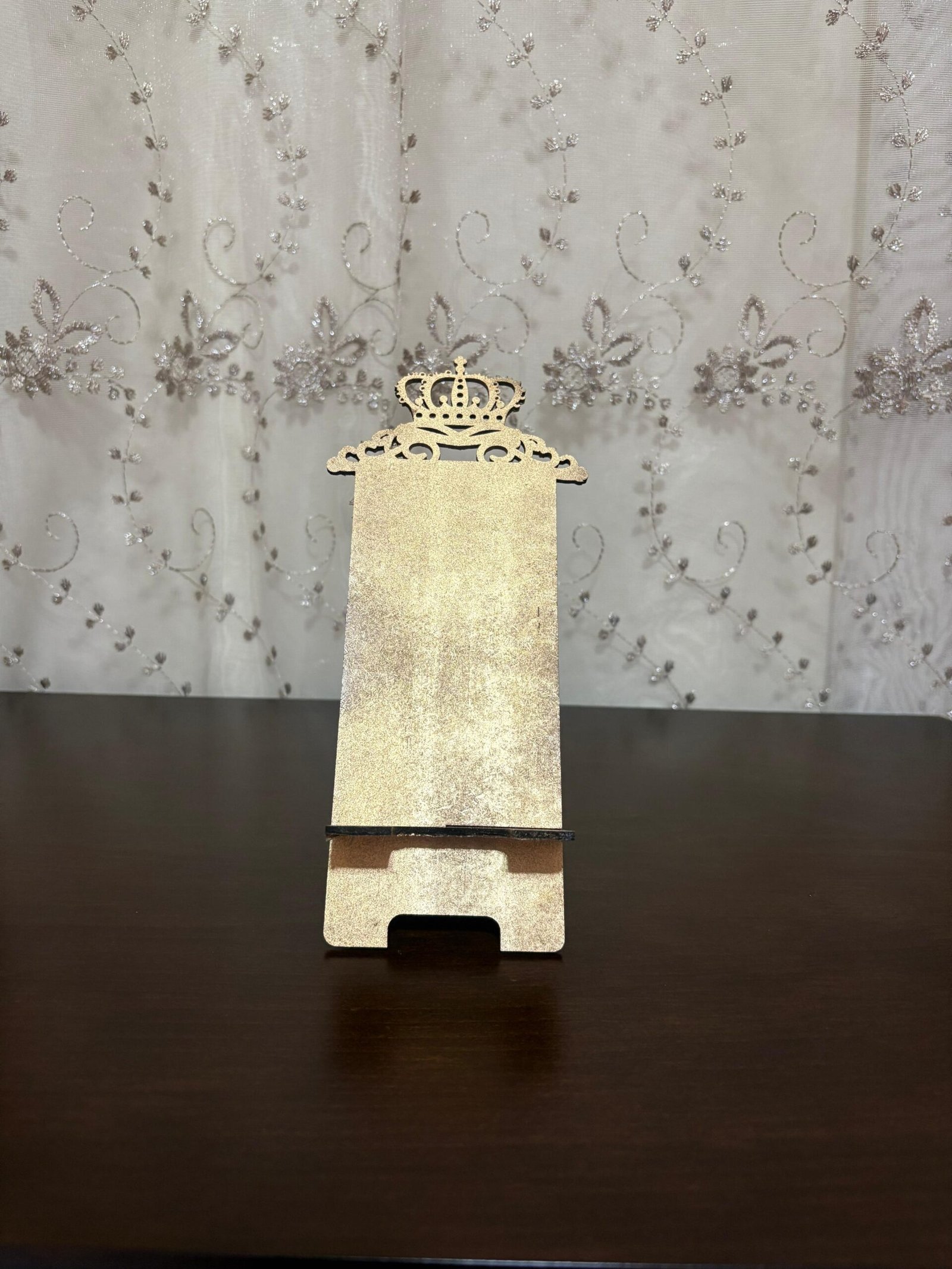 Add a touch of elegance to your desk or nightstand with this handcrafted wooden mobile stand. Featuring a royal crown design and available in multiple shimmering colors, it not only holds your phone securely but also adds a decorative flair. Perfect for watching videos, reading, video calls, or simply keeping your phone in place.