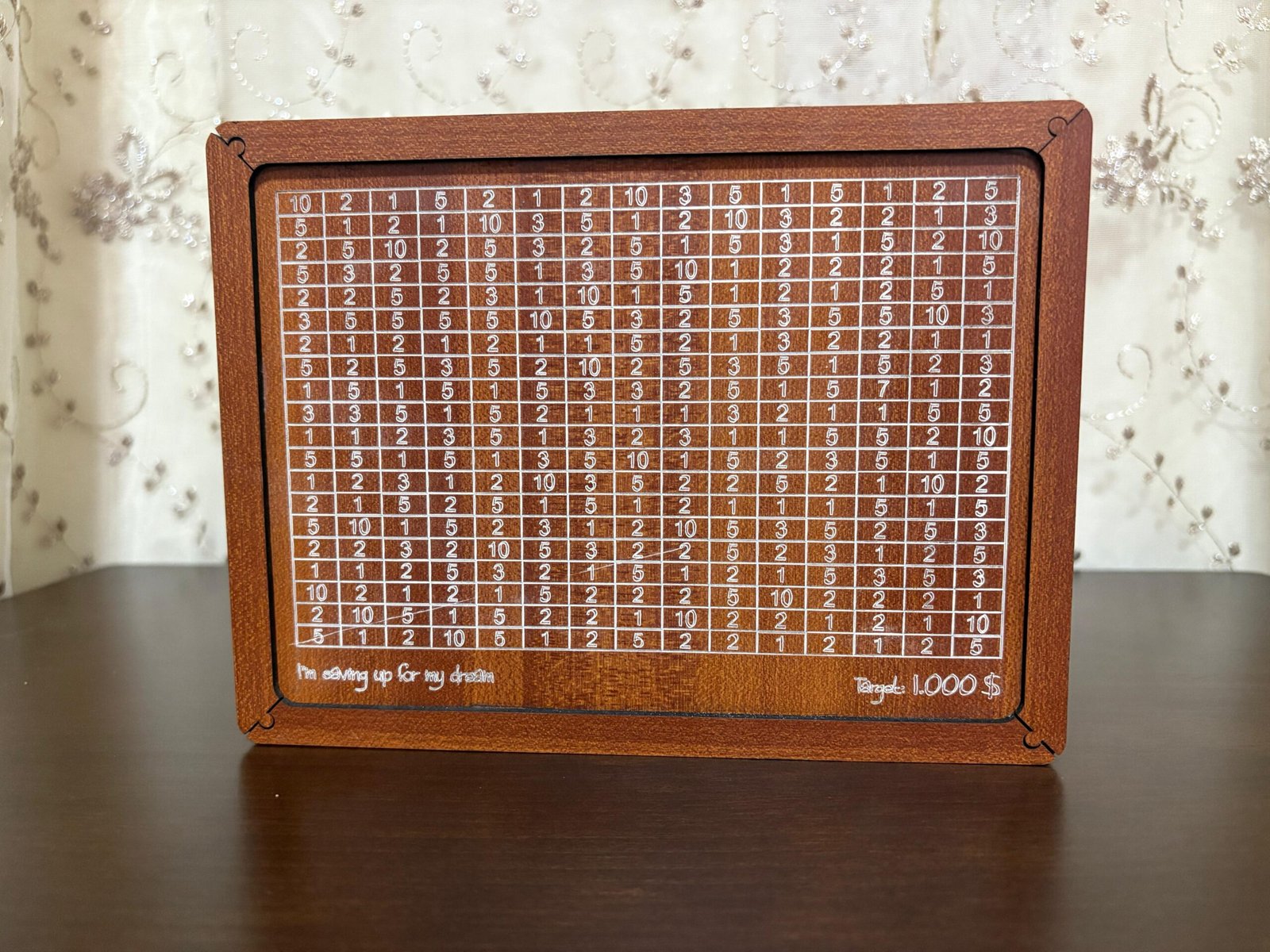 ✨ Beautifully Handcrafted: Made from high-quality wood with precision laser engraving, it features a clear savings grid to help you track your progress visually and stay motivated.